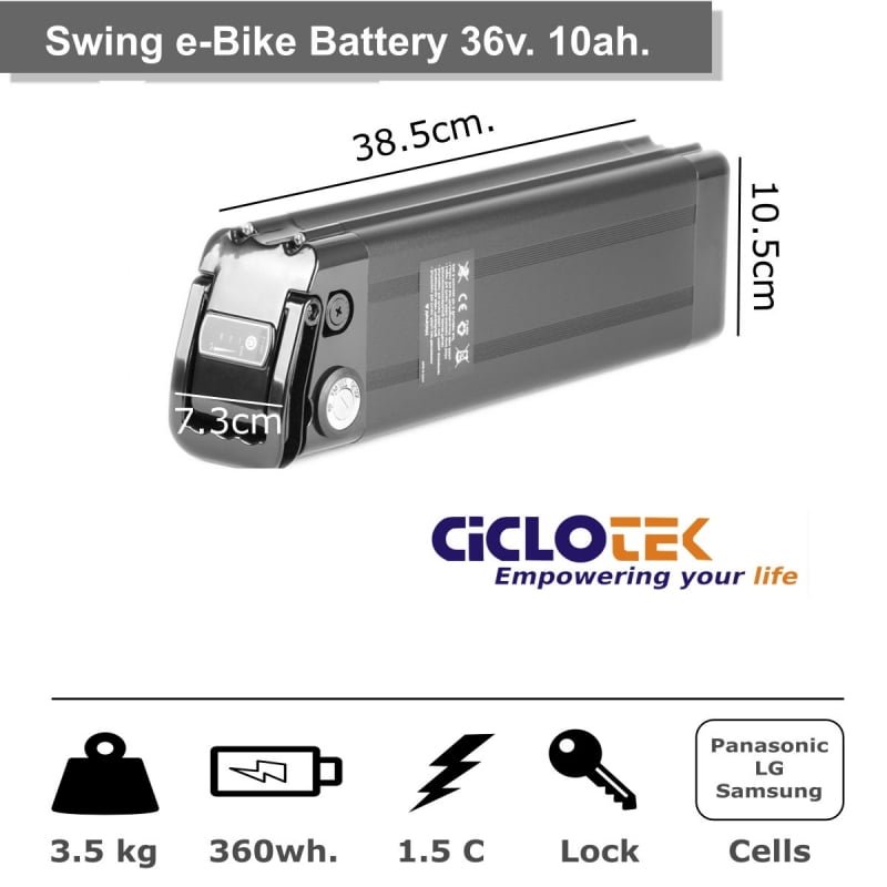 Batteria agli ioni di litio 36V e 10 Ah. Fino a 70 km di autonomia in condizioni ideali. Ricambio della batteria originale dei nostri tricicli Swing e compatibile con altri modelli simili sul mercato.