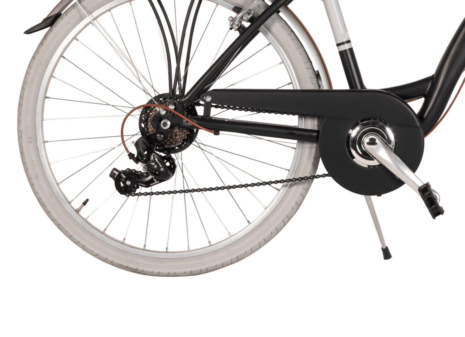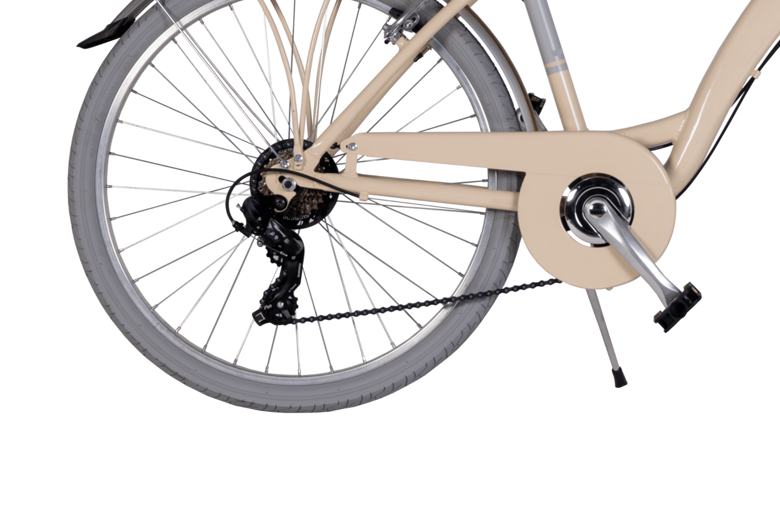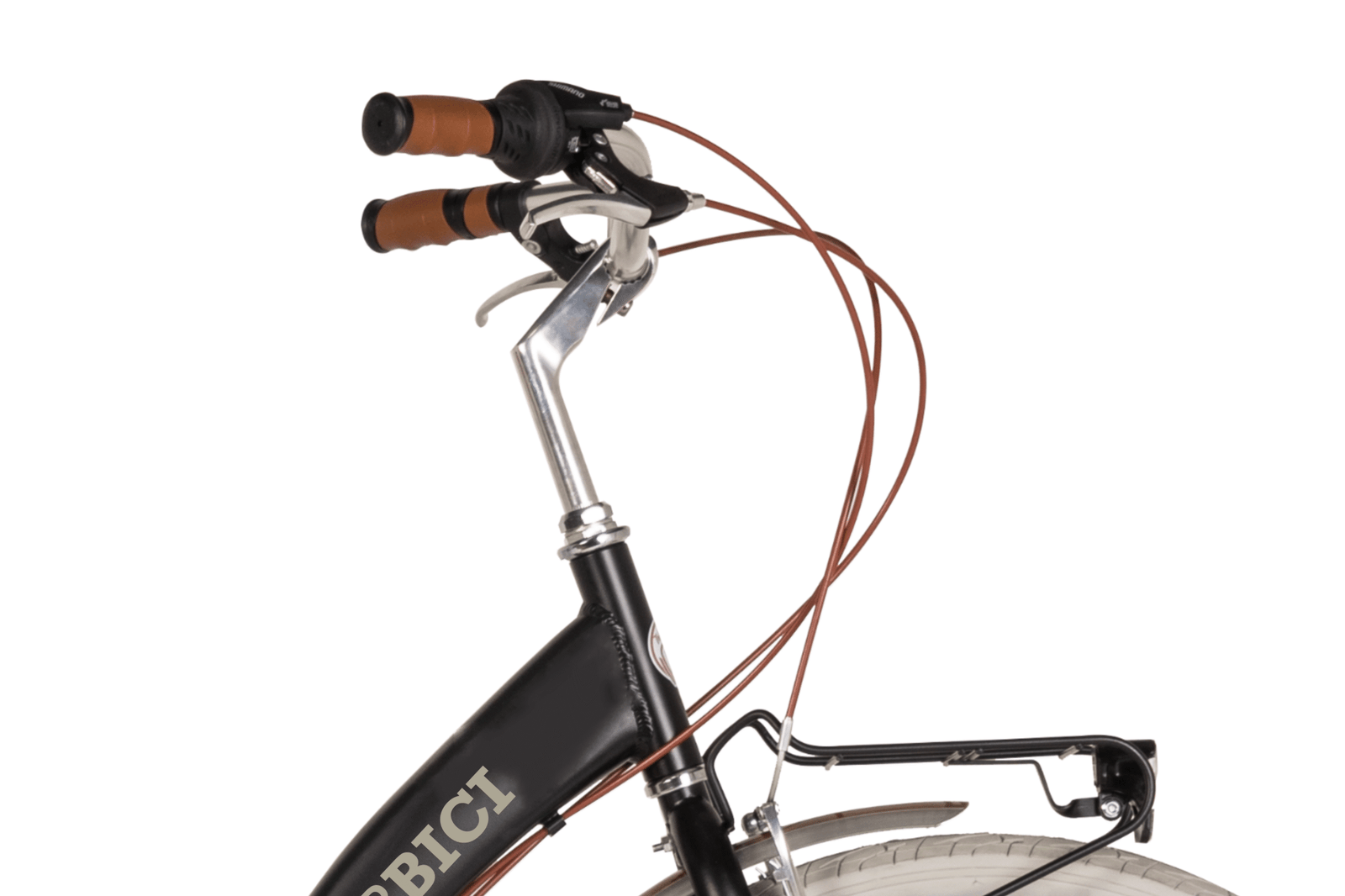 La nuova bici da passeggio Nuvò Lady è dotata di ruote 26 x 1.75, telaio in alluminio 46″, cambio SHTX300, 6 velocità, sella Bassano Selle, freni V-brake, cavalletto, luci LED, portapacchi anteriore e posteriore.