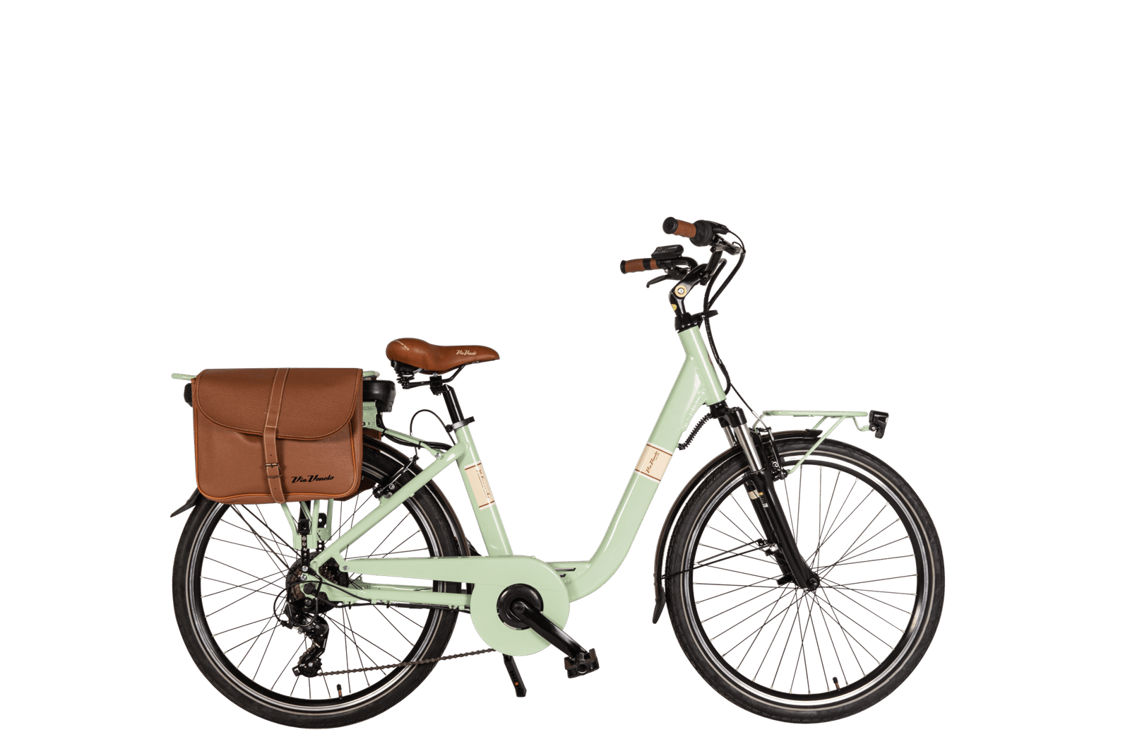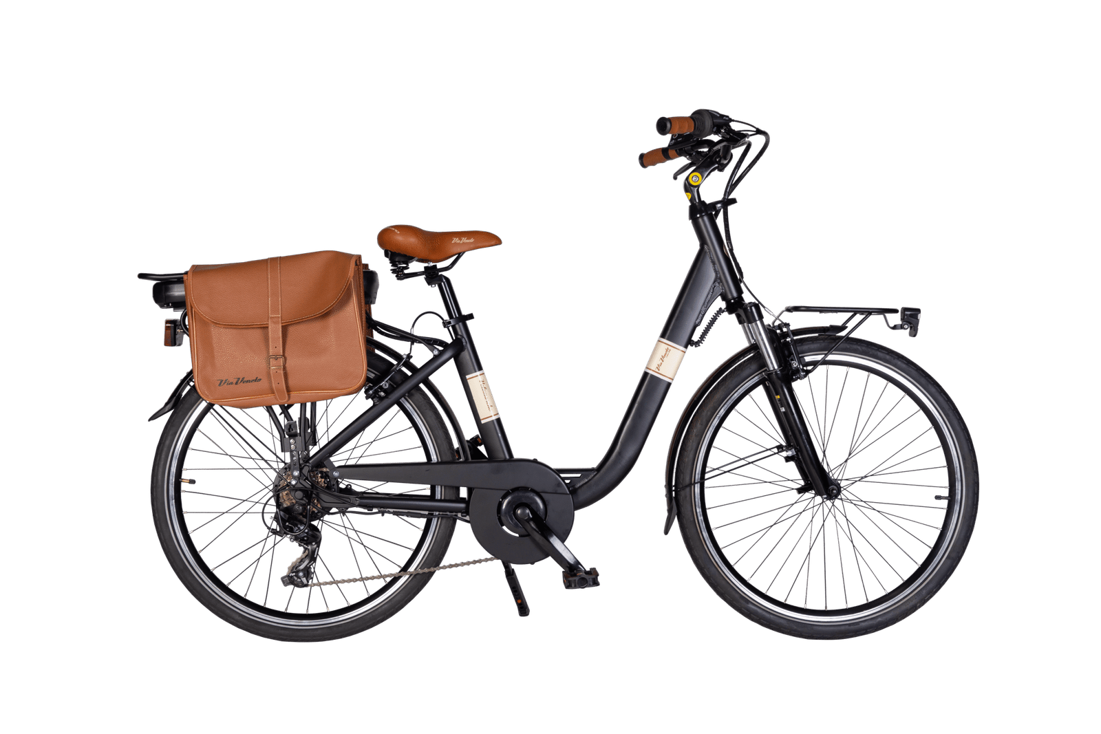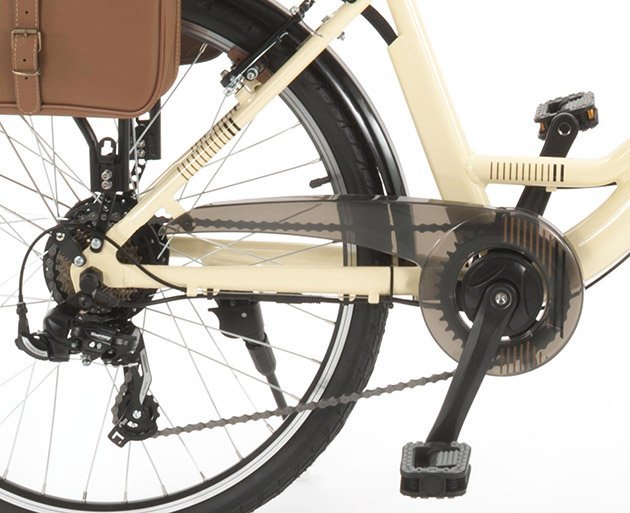 La Via Veneto E-62L è una bici elettrica in alluminio idroformato che raggiunge i 25 km/h; monta ruote 26″ x 1,75 (modello 26″) e 28 x 1,75 (modello 28″) a doppia camera con raggi rinforzati da 2,7 mm, freni Promax V-Brake in alluminio, cambio Shimano TX300 a 6 velocità, portata 90 kg, parafanghi, luci LED, batteria al litio 36V – 13Ah, potenza 468 W, motore 250W, display, ricarica minima 30-40 minuti, tempo di ricarica completa 5-6 ore, autonomia fino a 80 km con carica completa, peso 26,5 kg.
