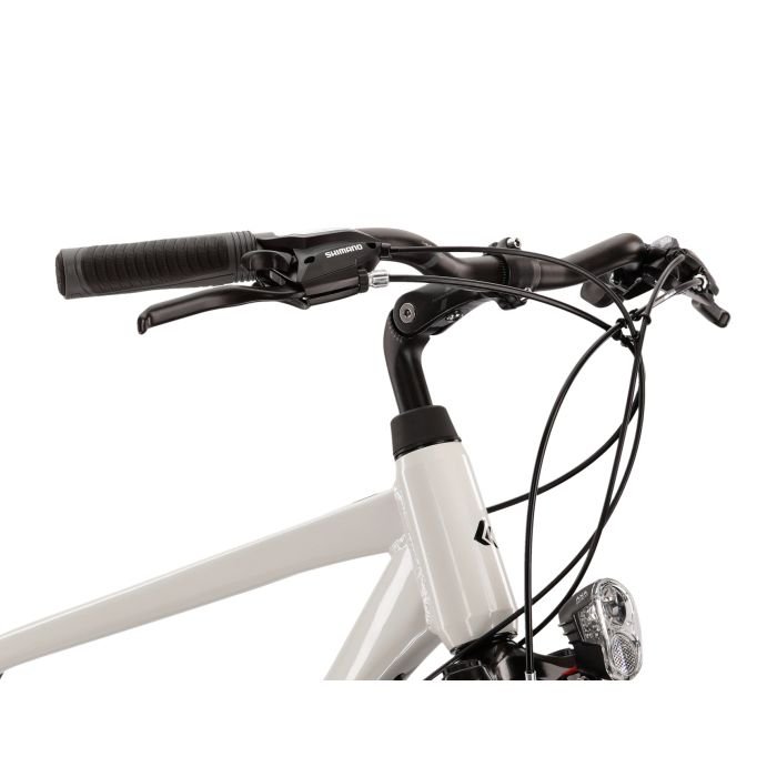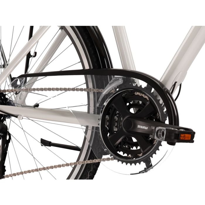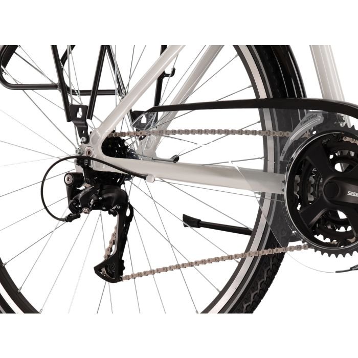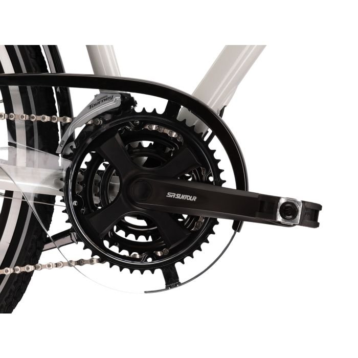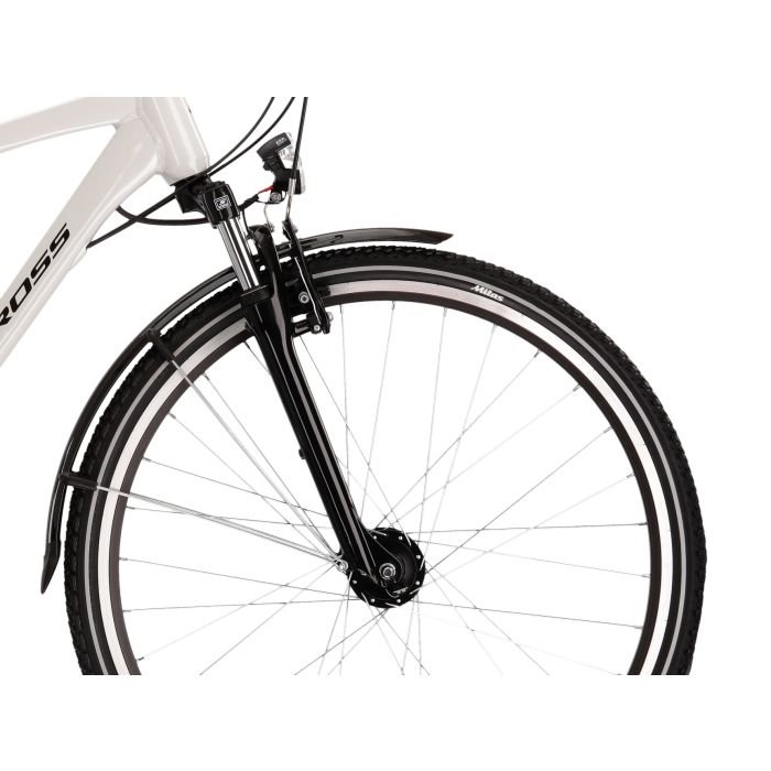 La KROSS Trans 4.0 è dotata di freni di alta qualità che ti garantiscono un’elevata potenza frenante su asfalto e su sterrati nel bosco. I pneumatici Mitas Gripper da 1,6″ permettono di usare la bici quasi in qualsiasi condizione meteo e assicurano una lunga durata. Inoltre, è equipaggiata con una trasmissione di qualità composta da componenti Shimano. Grazie all’uso del cambio posteriore Shimano Acera e del deragliatore anteriore Tourney, abbiamo ottenuto fino a 21 velocità. Ti renderanno più facile affrontare salite ripide e raggiungere alte velocità nei tratti pianeggianti. La KROSS Trans 4.0 monta anche la forcella ammortizzata SR Suntour M3010, che facilita la guida su fondi irregolari e assicura comfort su strade e percorsi dissestati.