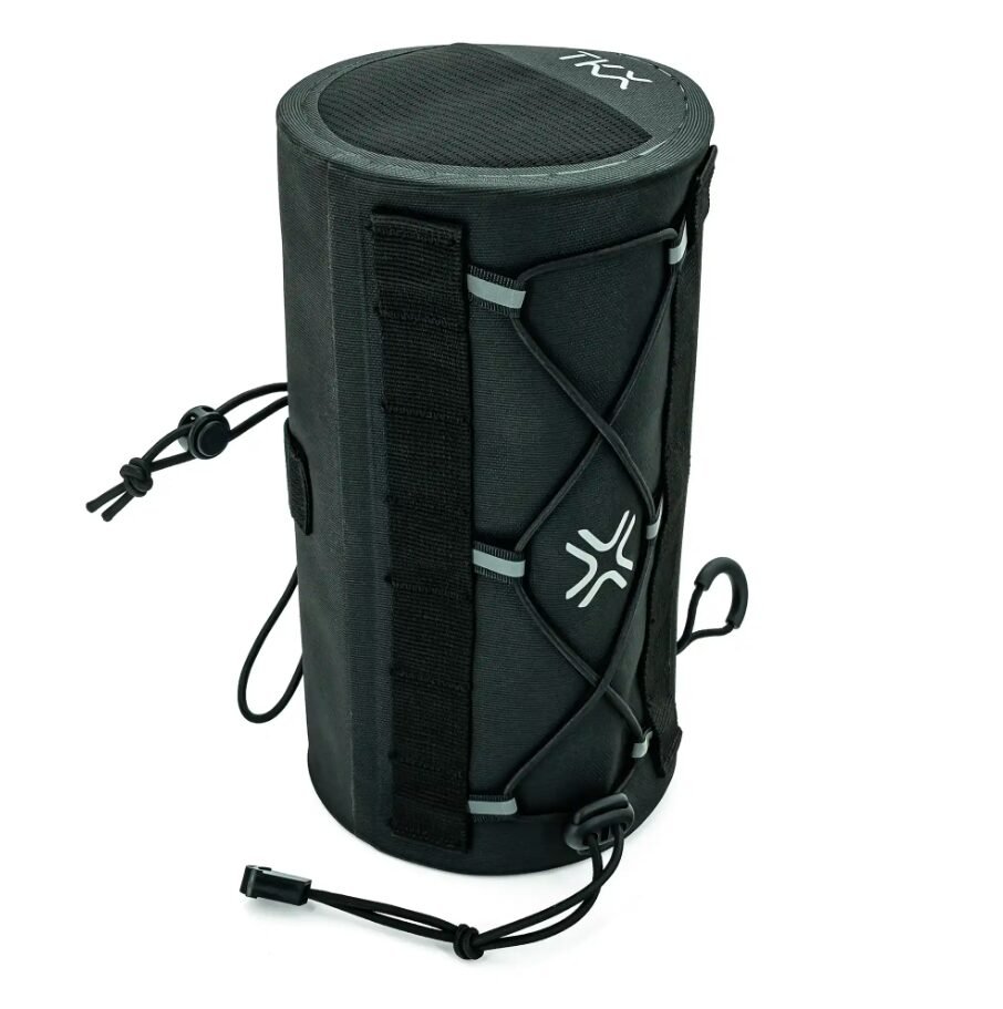 Il suo supporto speciale permette un fissaggio sicuro al manubrio, mentre il set di 7 cordini intercambiabili offre versatilità d’uso. Con una capacità di 3 litri e dimensioni di 23×12 cm, è dotata di pratiche tasche laterali per un rapido accesso ai tuoi oggetti essenziali.