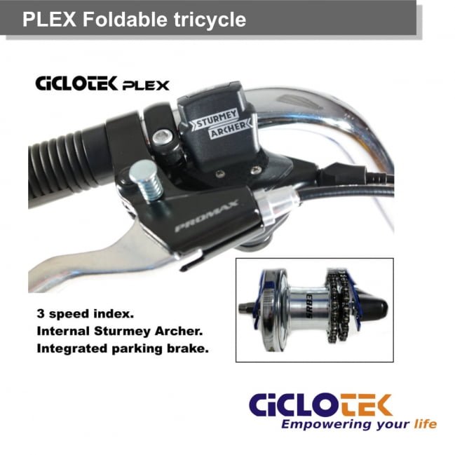 Pieghevole e compatto. Il nuovo triciclo PLEX è la soluzione ideale per chi cerca un mezzo facile da trasportare ma super accessoriato. PLEX è dotato di cambio interno a tre velocità, freno a mano e un pratico cesto posteriore. Triciclo per adulti con ruote da 20″ e carico massimo di 120 kg.